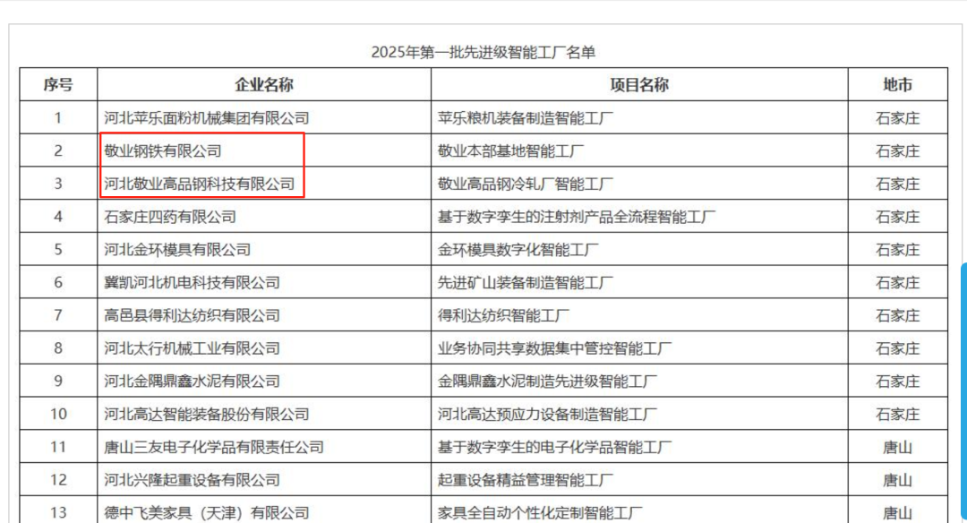 近日,河北省工业和信息化厅公布了2025年第一批先进级智能工厂名单。敬业钢铁有限公司、河北敬业高品钢科技有限公司凭借领先的智能制造水平成功入选。这一荣誉不仅是对敬业集团智能制造实力的高度认可,更是对集团积极响应国家制造业数字化转型智能化升级战略所取得成效的充分肯定。